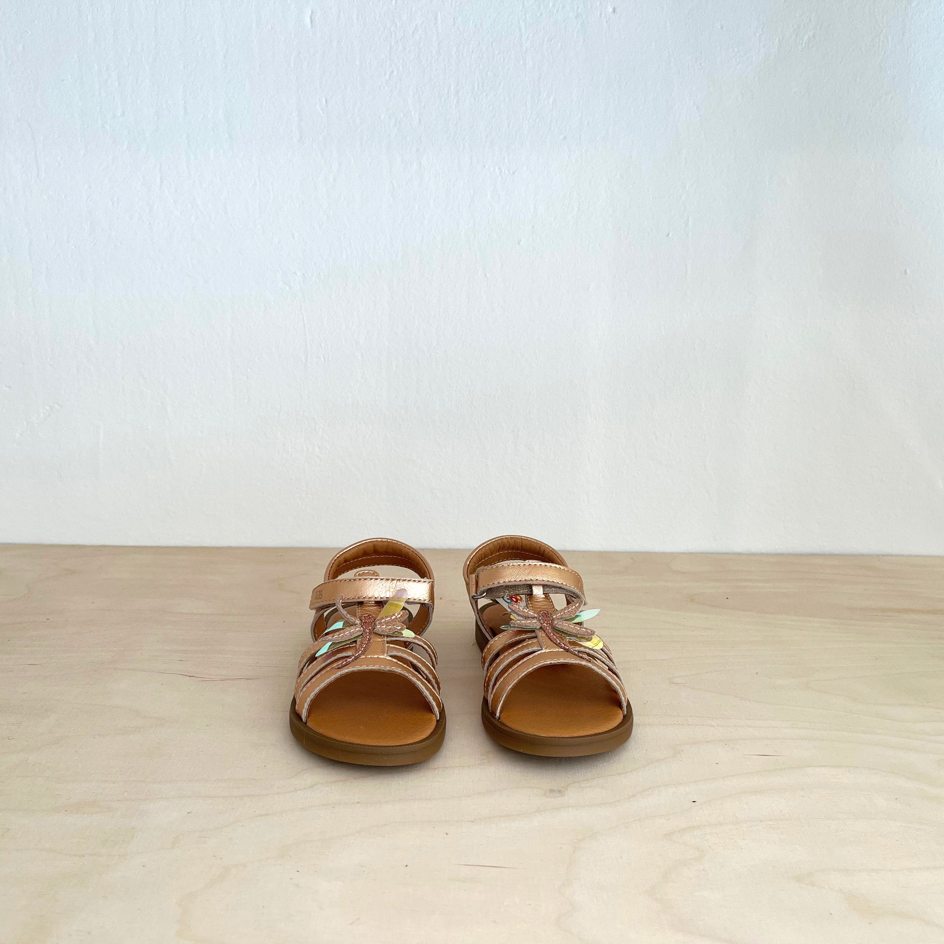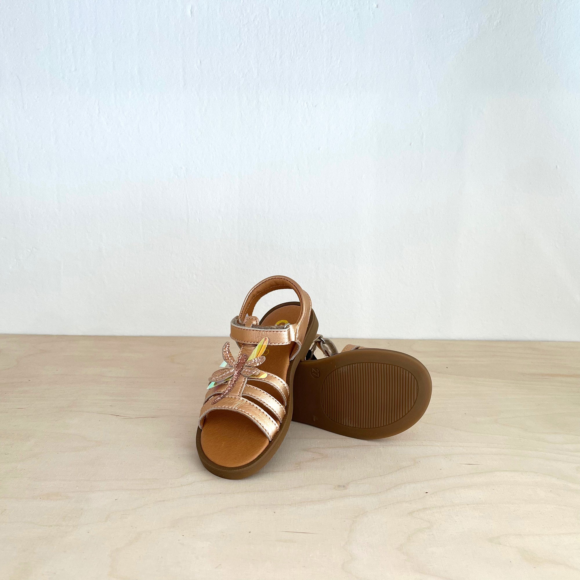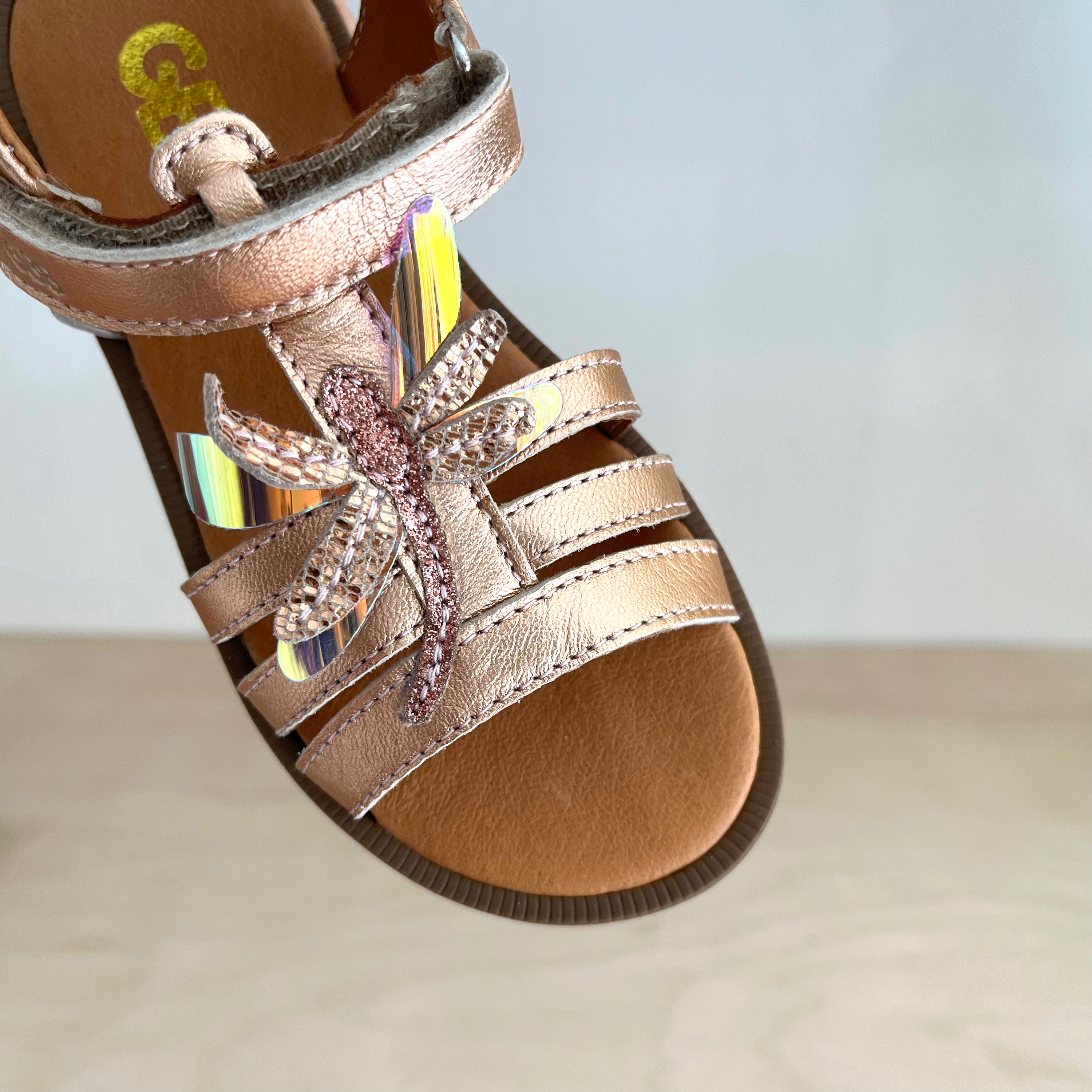 Die Libellen-Sandalen der französischen Marke GBB sind an der Verse durch Schaumstoff gepolstert und bestehen aus Leder und synthetischen Materialien.