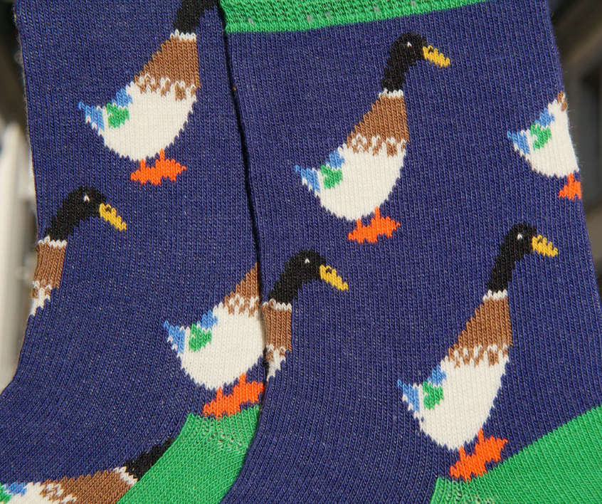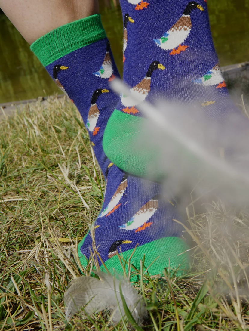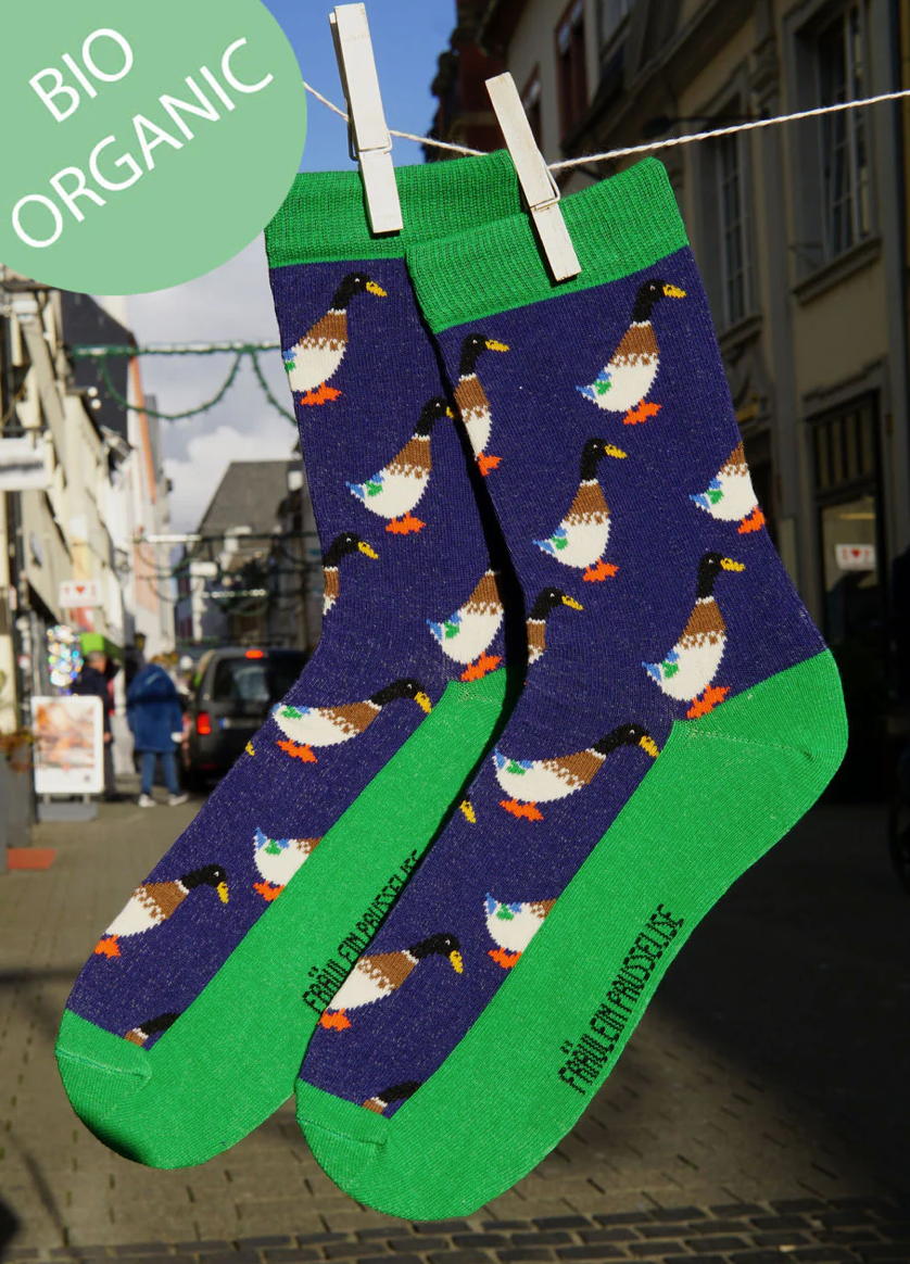 Socken für Kinder mit Enten aus Biobaumwolle. Sie ziehen sich beim Waschen ein wenig zusammen, nehmen ihre ursprüngliche Form beim Tragen aber wieder an. Solltest Du oder dein Kind zwischen zwei Größen stehen, wähle lieber die größere.