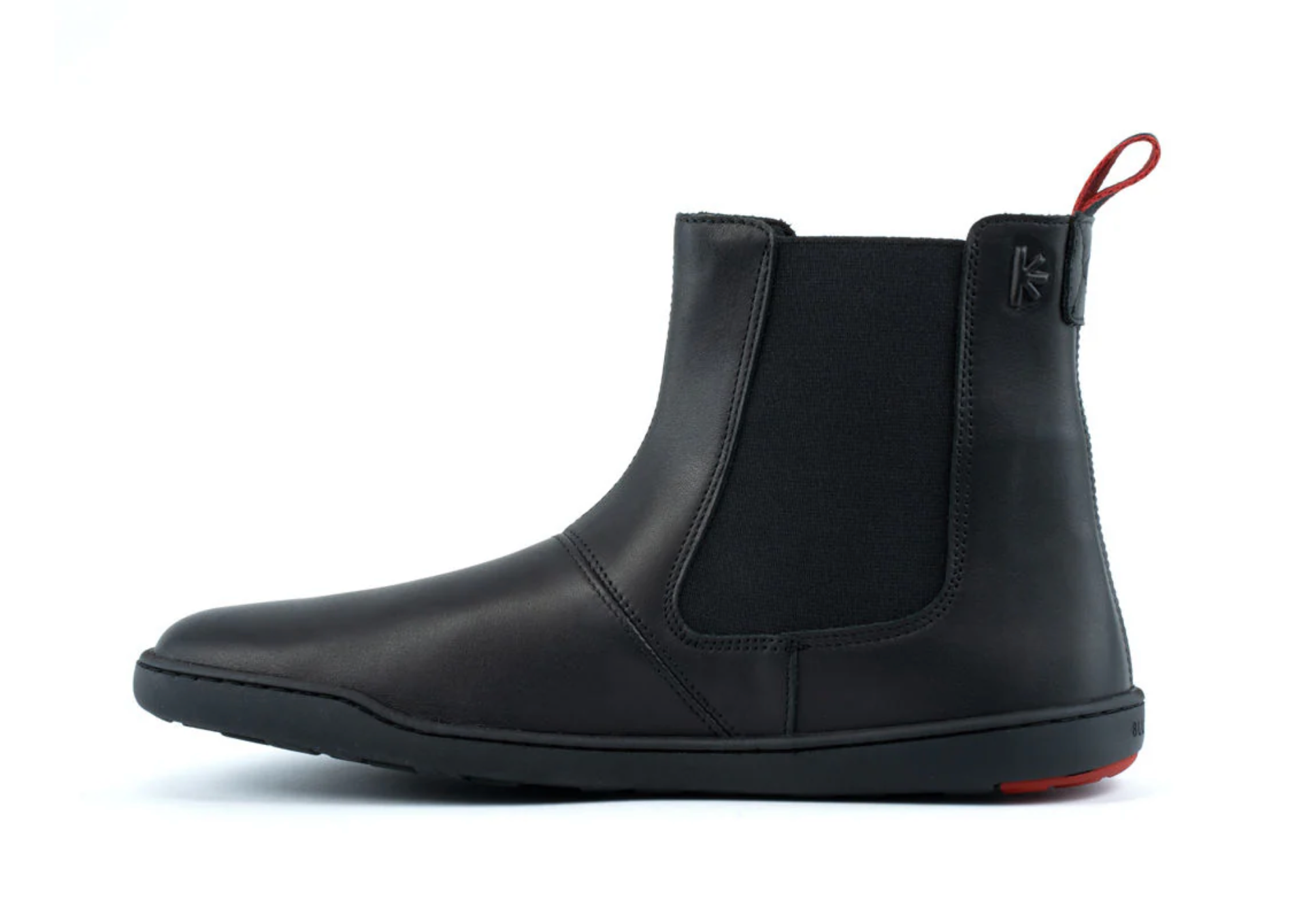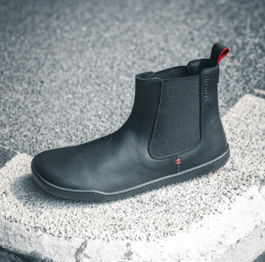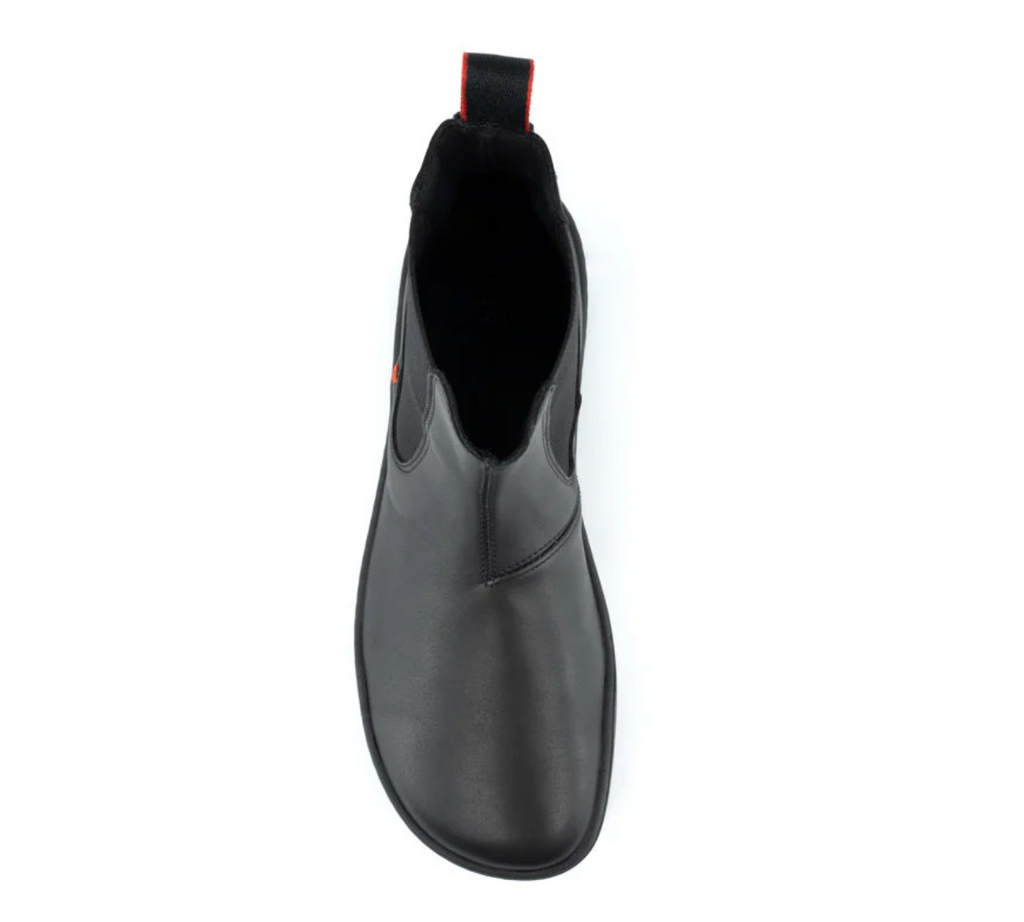 Elegante schwarze Damen-Chelsea-Boots aus glattem Leder. Dank flexibler Barfußsohle und breiter Form ist dieser vielseitig kombinierbare Barfußschuh modisch und gesund.