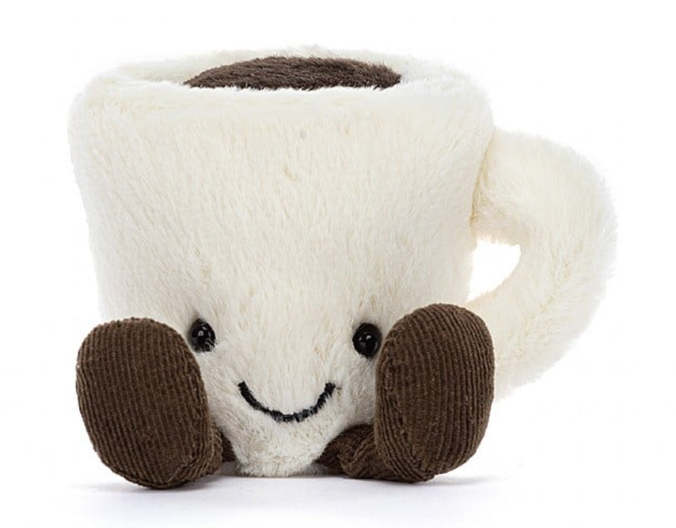 Flauschige Espressotasse von Jellycat. Sie fühlt sich wunderbar kuschelig und weich an.